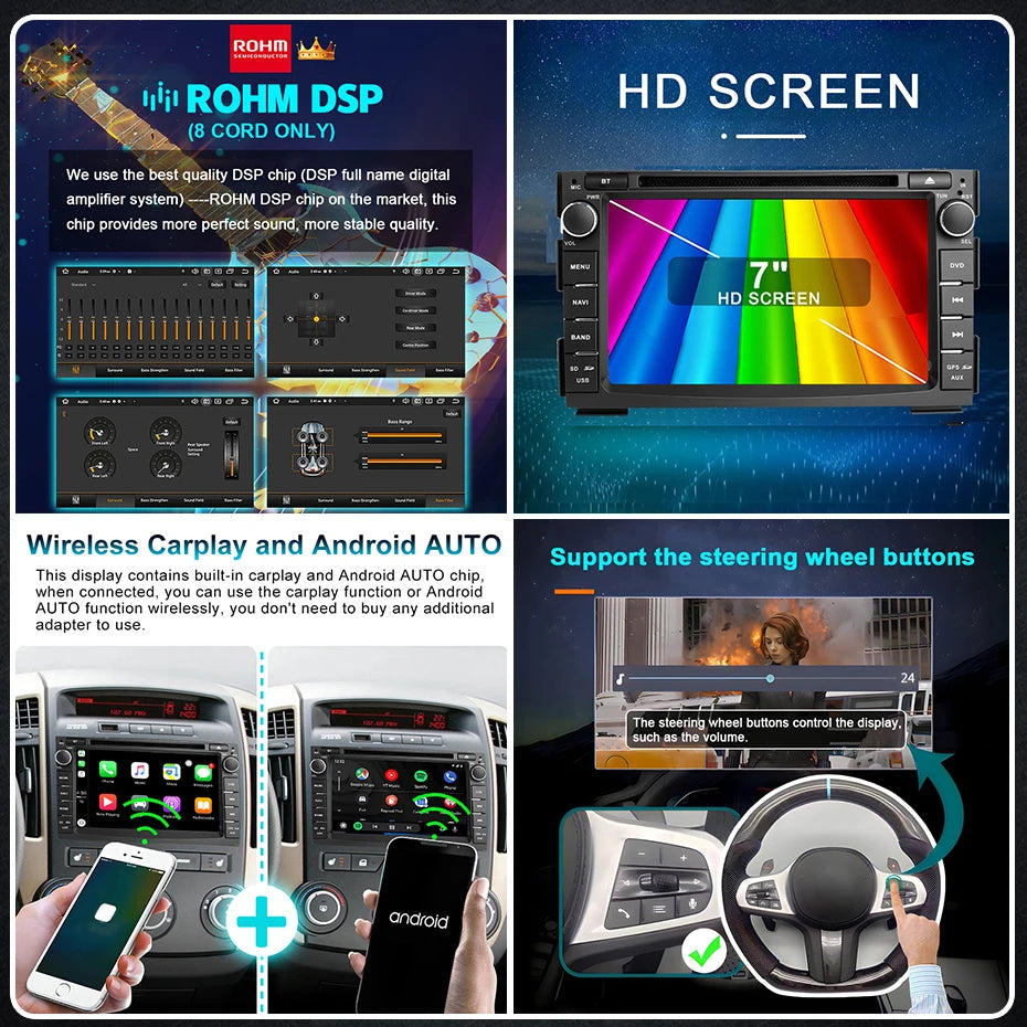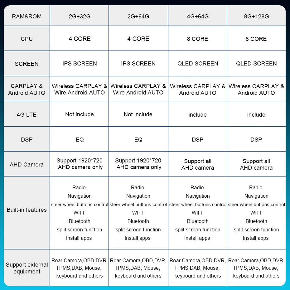 Prise en charge : CarPlay sans fil + Android Auto (optionnel), commande au volant, DSP (amplificateur numérique optionnel), Bluetooth, navigation GPS + GLONASS, WiFi 4G LTE